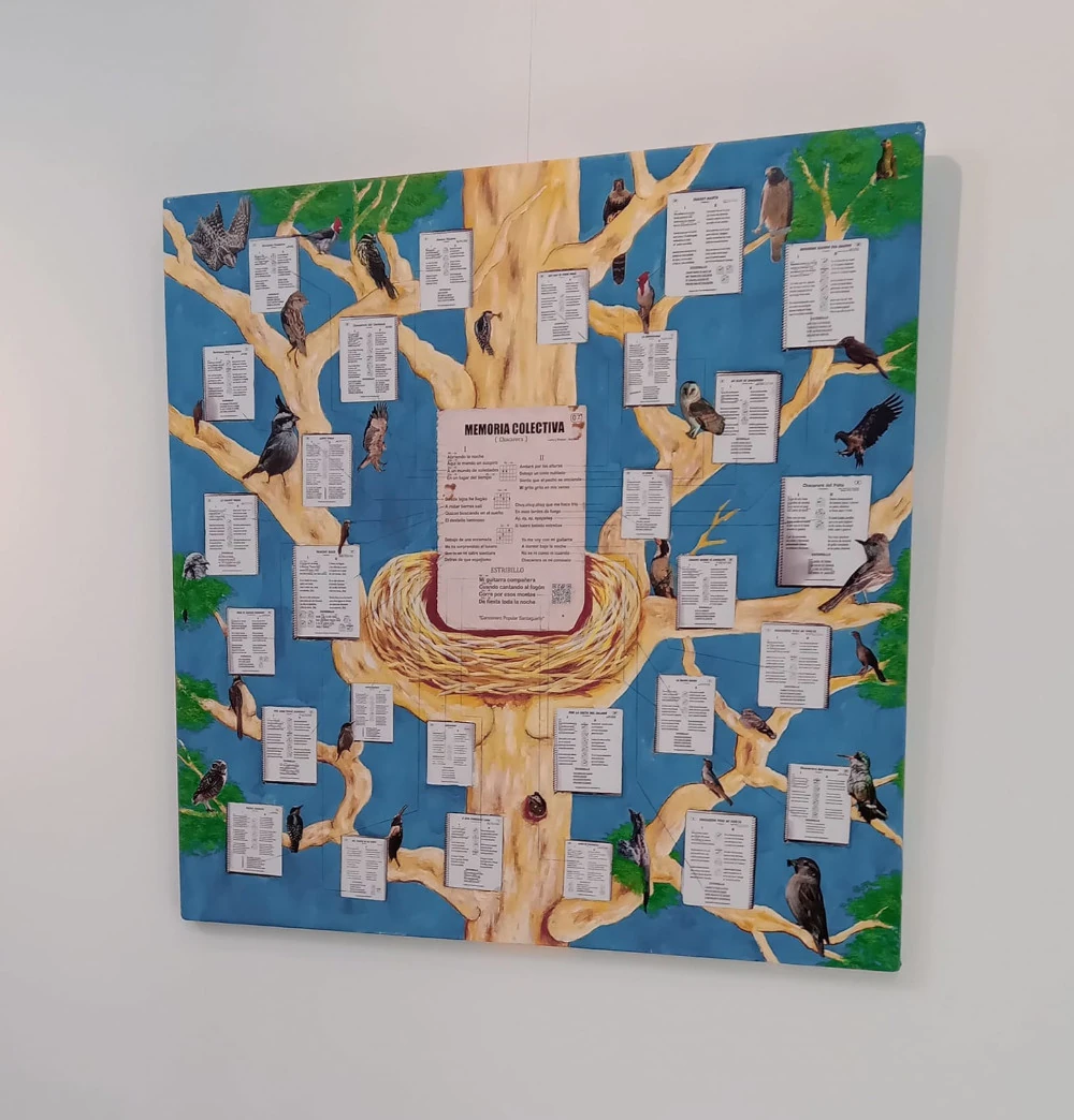 La obra "Soñé con...." es un ensayo de cruce entre la pintura, las letras, la música y la performance. En el centro de la pieza, se puede observar una canción con sus acordes, que esta compuesta por varias versos de diferentes chacareras del cancionero popular santiagueño, (*), con la intención de señalar lo recurrente de la temática de la noche/música/guitarra en distintas épocas del folklore de mi provincia. El interés principal pasa por investigar, de-construir y re-pensar la forma chacarera, y también reflexionar sobre problemáticas de autoría, originalidad y copia. Pensar en realizar una chacarera tomando fragmentos de otras, busca problematizar el proceso de composición de una letra para una canción. La atención fue puesta en las decisiones sobre que fragmentos incluir y más importante todavía; que excluir. Me interesó hacer visible este proceso; de ahí la presencia de las chacareras de donde se toman las líneas, con sus respectivos señalamientos. Por medio de un QR en la pagina central, la obra te posibilita a escuchar la performance de la chacarera "Memoria Colectiva" en Youtube.